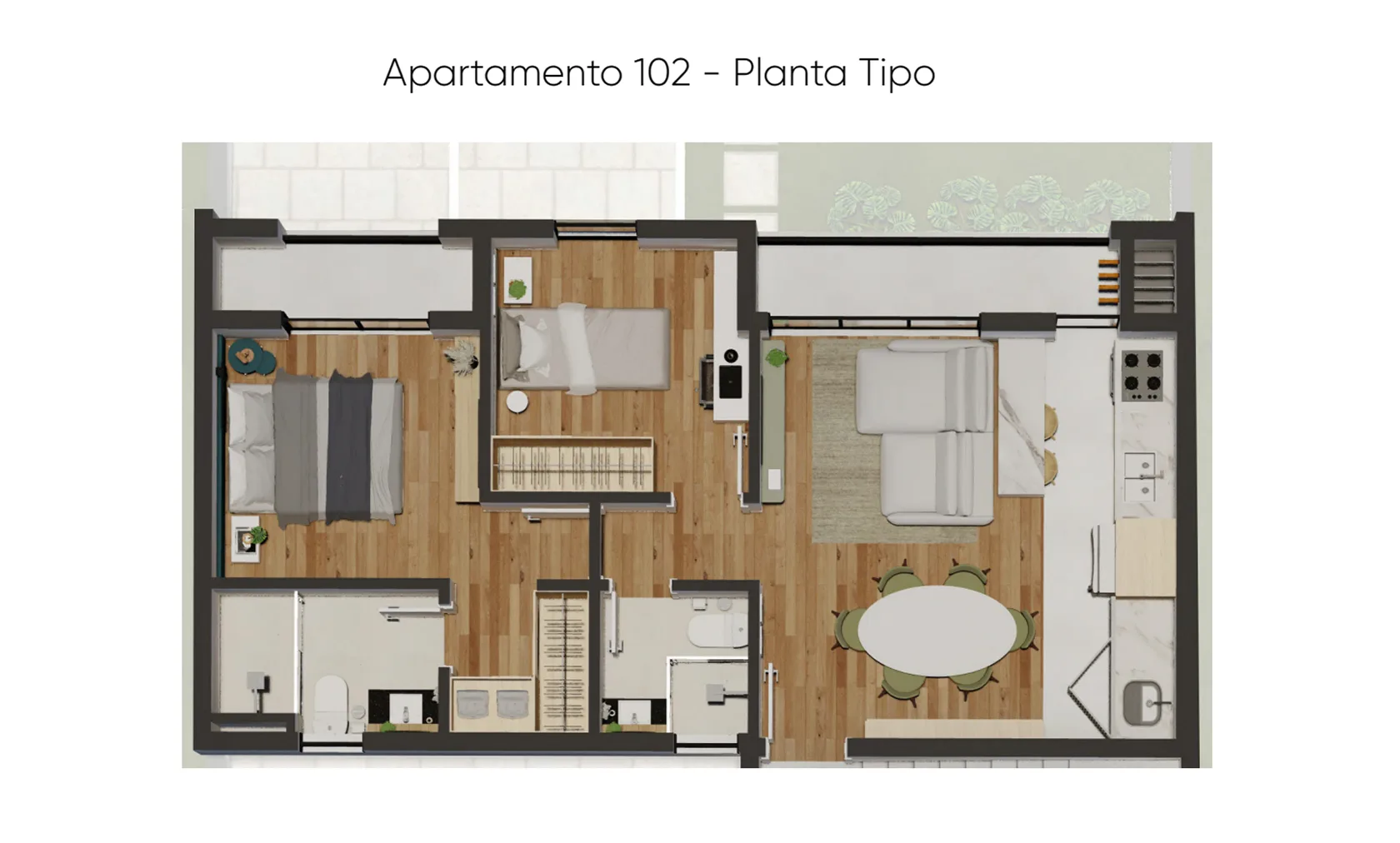 Cada unidade é composta por uma suíte com sacada, mais um quarto, sala com sacada e churrasqueira integrada, além de uma vaga de garagem.